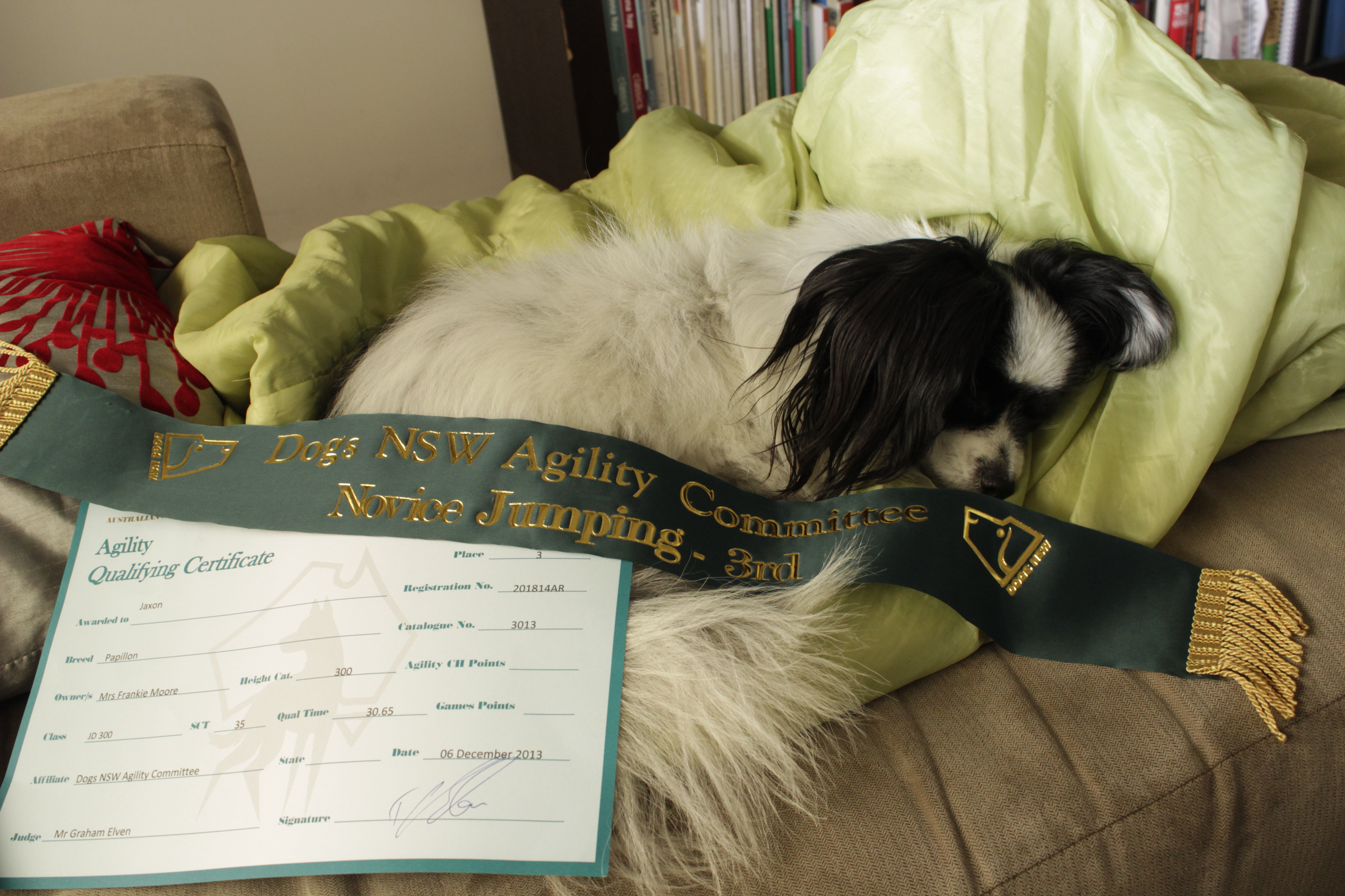 Our first run was a great start to the night, and it was a great challenging run. Not too difficult, not too easy, a couple of curve-ball angles and lines through the course. I was more nervous than I’d ever been, especially worried about Jason keeping attention on me. Before I new it the run was over, and unbelievably we had a clean run and a good time! That means a Qualification! I was so excited I jumped up and down – poor Jason couldn’t understand why I was so excited, and waited patiently for his treats. His patience was rewarded with a massive Jackpot and lots of hugs.