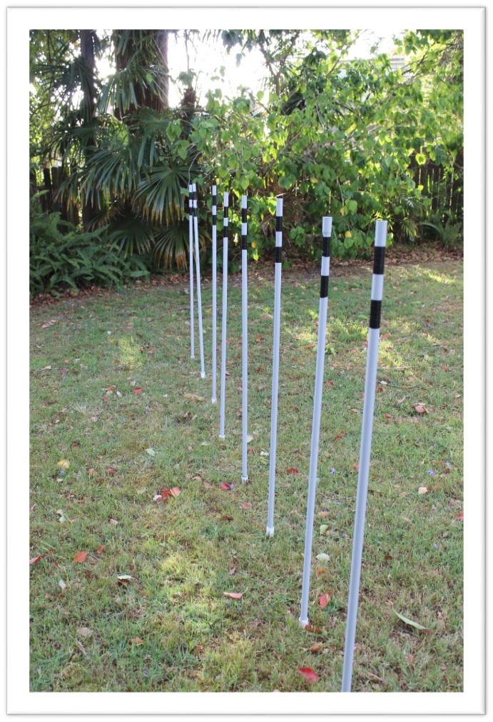 We made some weave poles for practice in the garden. They were pretty simple to assemble, and once they were up we had lots of fun trying to get the ball by going through the poles.